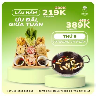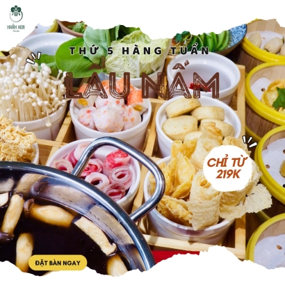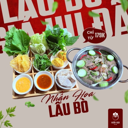 xem chi tiếtLẩu Nhẫn Hoa – Thanh nhẹ mà đậm đà, đẹp cả vị lẫn tâm hồn Lấy cảm hứng từ trà đạo và tinh hoa thảo mộc, các món lẩu tại Nhẫn Hoa mang đến vị thanh ngọt tự nhiên từ rau củ, nấm, hoa tươi và nước dùng ninh kỹ. Lẩu Trà Hoa Thanh Lọc – nhẹ bụng, đẹp da Lẩu Tomyum Nhẫn Hoa – cay chua dịu nhẹ kiểu Thái Lẩu Dưỡng Nhan – kết hợp hoa hồng, kỷ tử, táo đỏ... Mỗi nồi lẩu là một bản hòa ca của hương – vị – sắc, dành cho người biết thưởng thức.